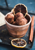 Proces tworzenia zdrowy deser: trufle czekoladowe na desce, pół pomarańczy i kakao w proszku na pergaminie papieru.