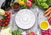 Pojęcie diety i pokarm roślinny. Płytki z marmuru wzorców. Różnych warzyw i przypraw (brokuły, pieprz, pomidory, czosnek, sałata, pietruszka, Koper), na jasnym tle. Widok z góry, kopiować miejsca. Tło żywności. Tonowanie