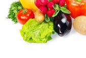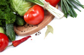 Asortyment świeżych warzyw (pieprz, pomidory, cebula, czosnek, szpinak, brokuły) na ciemnym tle. Deska do krojenia drewniana. Widok z góry, kopiować miejsca. Tło żywności. Tonowanie