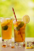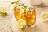Ice herbaty z cytryna i mięta na tle drewnianych. Kopiować miejsca. Tło żywności. Tonowanie