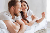 Portret podekscytowany para małżeńska, patrząc na wynik testu ciążowego