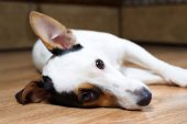 pies Jack Russell na piętrze z wiele żywności fo częściowy czekam na start, jedzenie