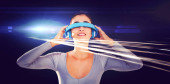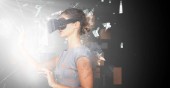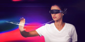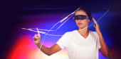 Kobieta w zestawie słuchawkowym Vr dotykając 3d planety na czarnym tle z zielony i fioletowy flary