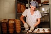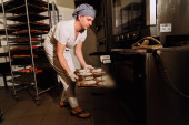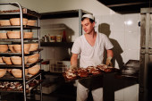 Przystojny baker w jednolite gospodarstwa tacą pełną świeżo upieczonego chleba w produkcji