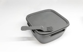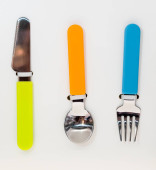 Kolorowe plastikowe widelce i noże w pomarańczowy plastikowy kubek