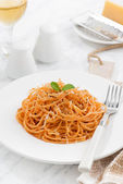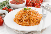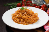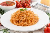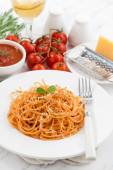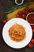 Spaghetti z sosem pomidorowym i składniki na drewnianym stołem