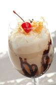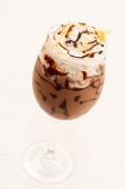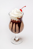 Pobłażliwy ekstremalne czekoladowych z ciasto brownie, truskawki, wiśnie i słomy z pianką mleka na górze w miękkim brązowym tle plastikową