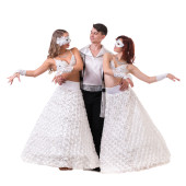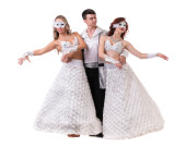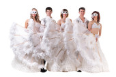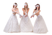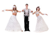 Na białym tle trzech tancerzy karnawał ubrany w maskę, taniec,