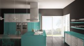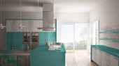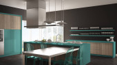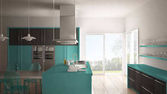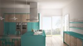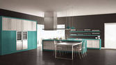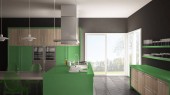Zdjęcie "Minimalistyczny nowoczesna kuchnia ze stołem, krzesłami i wyłożoną parkietem podłogę" może być wykorzystywane do celów osobistych i komercyjnych zgodnie z warunkami zakupionej licencji Royalty-free. Obraz jest dostępny do pobrania w jakości wysokiej rozdzielczości do 5760x3840.