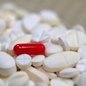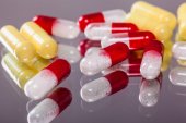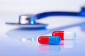rode en witte capsules (bolus) op violet, macro weergave medische con