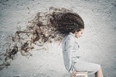 Młoda kobieta smutny klęcząc na pustyni, na tle nieba.