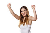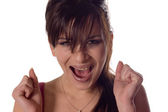 Piękna młoda kobieta, zaciskając pięści, stojąc nad białym tle.