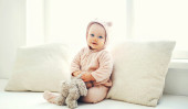 Szczęśliwy uśmiechający się dziecko bawiące się w domu w białym pokoju, w pobliżu okna
