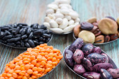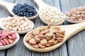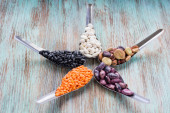 Żółta soczewica, czarny, biały, brązowy, fioletowy fasoli na metalową łyżką