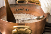 gotowania syropu cukru miedzi patelni z termometrem i duża łyżka. Brązowy kolor z powodu parowania.