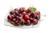 Całości i połówki dojrzałej wiśni na białym talerzu