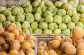 Zdjęcie "Egzotycznych owoców tropikalnych, Flaszowiec miękkociernisty wyświetlacz do sprzedaży w rynku." może być wykorzystywane do celów osobistych i komercyjnych zgodnie z warunkami zakupionej licencji Royalty-free. Obraz jest dostępny do pobrania w jakości wysokiej rozdzielczości do 5760x3840.