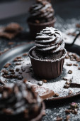 Czekolada eklerów, ozdobiony małym Stożkiem na ciemnym tle drewnianych. Babeczki są wylewa z ciemnej czekolady i kakao w proszku. Babeczki z niezwykłych dekoracji. Niski klucz