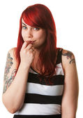 młody kaukaski kobieta patrzy i gryzienie jej paznokieć