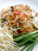 Tajski food Pad Thai, wymieszać smażyć makaron z krewetkami w białej płytce. Jeden z Tajlandii główne danie narodowe. Popularne żywności w Tajlandii. Makaron smażony tajski.