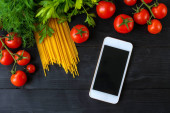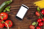 Świeże warzywa dietetyczne, szklanka soku pomidorowego i smartpho