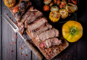Zdjęcie "Rumsztyk, Rumpsteak wołowiny z grilla w plasterkach na blasze do pieczenia z warzywami." może być wykorzystywane do celów osobistych i komercyjnych zgodnie z warunkami zakupionej licencji Royalty-free. Obraz jest dostępny do pobrania w jakości wysokiej rozdzielczości do 5760x3840.