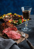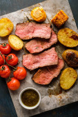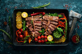 Rumsztyk, Rumpsteak wołowiny z grilla w plasterkach na blasze do pieczenia z warzywami.