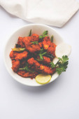Kurczaka 65 - pikantne, smażone w głębokim tłuszczu Bar zakąska lub szybką przekąskę z Indii na patelni na białym tle, Selektywny fokus
