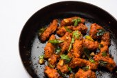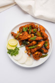 Kurczaka 65 - pikantne, smażone w głębokim tłuszczu Bar zakąska lub szybką przekąskę z Indii na patelni na białym tle, Selektywny fokus