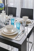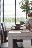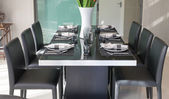 jadalni drewniany stół i wygodne krzesła w nowoczesnym domu z eleganckie nakrycia stołu