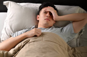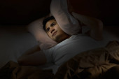 Przygnębiony człowiek cierpi na bezsenność, leżąc w łóżku