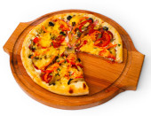 apetyczny pizza z serem na wyciąć kawałek drewnianej tacy blisko