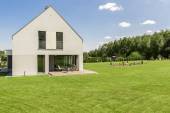 Zdjęcie "Na zewnątrz elegancki dom jednorodzinny z ogrodem" może być wykorzystywane do celów osobistych i komercyjnych zgodnie z warunkami zakupionej licencji Royalty-free. Obraz jest dostępny do pobrania w jakości wysokiej rozdzielczości do 5760x3840.