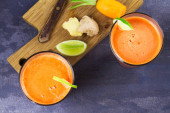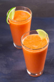 Zdjęcie "Marchew imbir smoothie, przyozdobionym z limonki" może być wykorzystywane do celów osobistych i komercyjnych zgodnie z warunkami zakupionej licencji Royalty-free. Obraz jest dostępny do pobrania w jakości wysokiej rozdzielczości do 5760x3840.