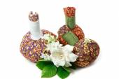 Kwitnący kwiat Biały Lotos pływający w drewniane miski traktuje spa