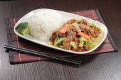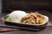 smażona wieprzowina z ryżem i warzywami-tajskim jedzeniem