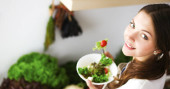 Młoda kobieta jedzenie sałatka i trzymając mix sałat