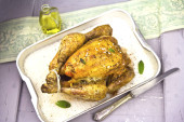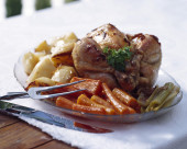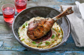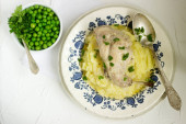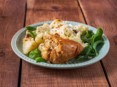 Pierś indyka pieczona z suszonych śliwek, tłuczone ziemniaki i sałatka ogórkowa