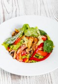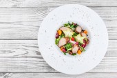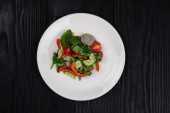 Świeże sałatki z rukola, sałata, pomidory cherry, ogórek, kalafior, papryka na podłoże drewniane. Widok z góry