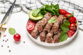 Zdjęcie "Produkty grill: stek, kiełbasa i warzyw na rustykalne drewnianym stole. Kiełbaski z grilla pan na podłoże drewniane. Poziomej przestrzeni kopii." może być wykorzystywane do celów osobistych i komercyjnych zgodnie z warunkami zakupionej licencji Royalty-free. Obraz jest dostępny do pobrania w jakości wysokiej rozdzielczości do 5760x3840.