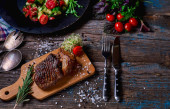 Produkty grill: stek, kiełbasa i warzyw na rustykalne drewnianym stole. Kiełbaski z grilla pan na podłoże drewniane. Poziomej przestrzeni kopii.