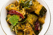 Popularne danie indyjskie warzyw dyni suche curry lub kaddooor kaddu ki sabzi w hindi, lal bhopla chi bhaji w marathi, Selektywny fokus