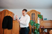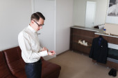 Portret przystojny pan młody, ubieranie się i przygotowuje się do h