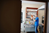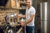 Zdjęcie "Portret przystojny narzeczony picia kawy w kuchni." może być wykorzystywane do celów osobistych i komercyjnych zgodnie z warunkami zakupionej licencji Royalty-free. Obraz jest dostępny do pobrania w jakości wysokiej rozdzielczości do 5760x3840.