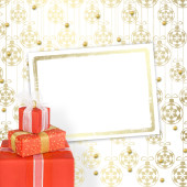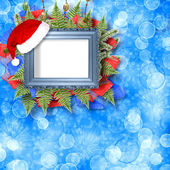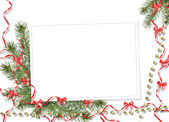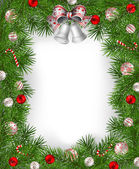 Bombki i czerwona kokarda z dzwonów na tle snowy jodła b