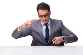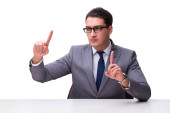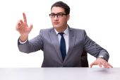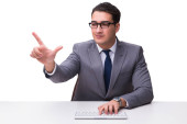 Młody biznesmen wciskający wirtualne przyciski na białym bac