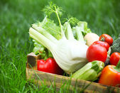 Świeże warzywa w płycie na trawie. Zdrowe jedzenie. Diety