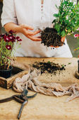 Ogrodnicy ręcznie sadzenie kwiatów w doniczce z brudu lub gleby.
