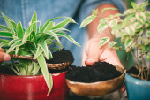 Ogrodnicy ręcznie sadzenie kwiatów w doniczce z brudu lub gleby.