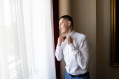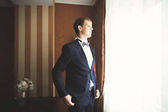 Portret wspaniały Pan młody przebrania na ślub i dostać